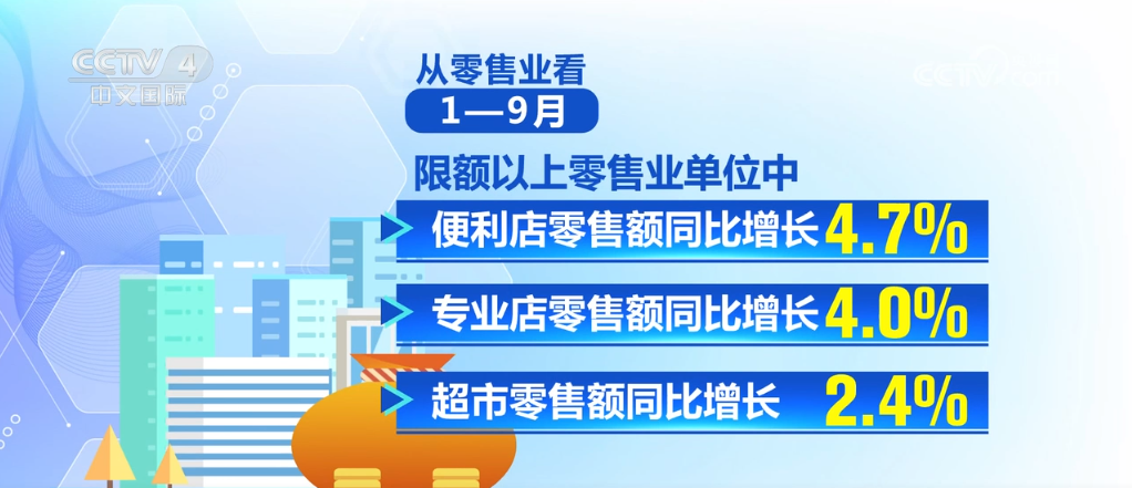 1—9月,批发和零售业增加值9.4万亿元,同比增长5.4%,占GDP比重为9.87%,批零市场运行平稳,多数业态保持增长。从批发业看,1—9月,商务部重点联系商品市场成交额同比增长6.8%,其中生产资料类、工业消费品类市场成交额同比分别增长12.5%、7.5%。从零售业看,1—9月,限额以上零售业单位中,便利店、专业店、超市零售额保持增长态势,同比分别增长4.7%、4.0%、2.4%。